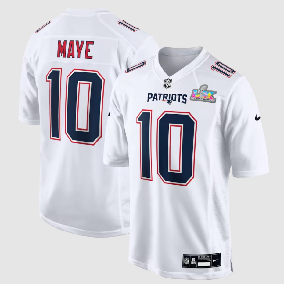 Men's New England Patriots Drake Maye Nike White Super Bowl LXPatch Tundra Fashion Game Jersey